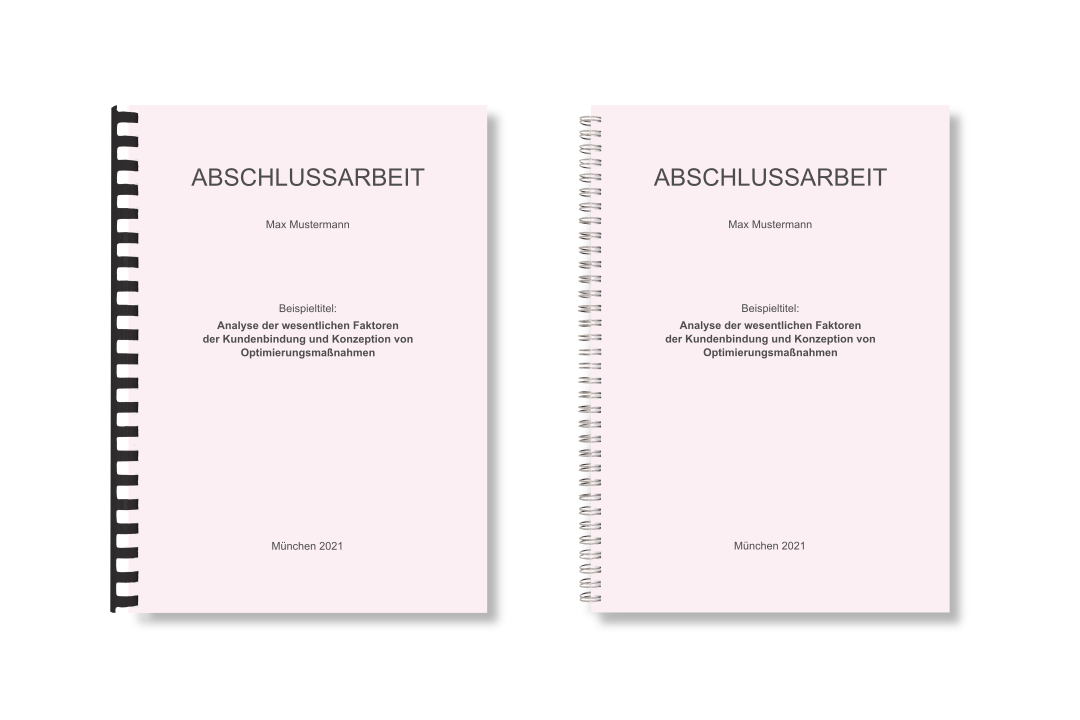 Die Ringbindung, oftmals auch nur Spiralbindung genannt, bieten wir Ihnen in zwei Varianten als Plastikringbindung und als Drahtringbindung an. Die Ringbindung enpfiehlt sich oft bei Haus- und Seminararbeiten und überall dort wo ein gutes, planes Aufschlagverhalten gewünscht ist. Die höherwertige Metallringbindung bietet gegenüber der kostengünstigeren Plastikringbindung ein besseres Aufschlag- sowie Umschlagverhalten. Ein transparentes Deckblatt, sowie ein hochwertiger, ledergenarbter Bindekarton bieten den gebundenen Blättern einen optimalen Schutz.
